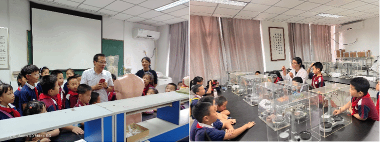 同时,基地充分发挥多学科融合优势,同时开放力热、光学、物理化学、生物和食品科学等专业学科实验室,引导学生多维度、多视角体验科学,感受科学。生科院王宏元老师向学生们讲解了身体的构造,对人体不同器官的功能进行了科普;动植物实验室彭菊芳老师向学生们展示了显微镜下植物叶片横切结构,对实验室内种植的景天科多肉植物进行了介绍;食品实验室马志爽老师为学生揭秘了生活中常见细菌、霉菌的形态,让学生明白养成勤洗手等良好卫生习惯的重要性;物化实验室魏彦林老师给学生讲述了电子天平的使用、水的硬度检测和家用食醋的酸度相关知识等;光学实验室石静瑜老师跟学生分享了透镜成像、偏振光方面的知识等;力热实验室卫芬芬老师给学生们介绍了传统的天秤构造和使用,认识了解气垫导轨等。
